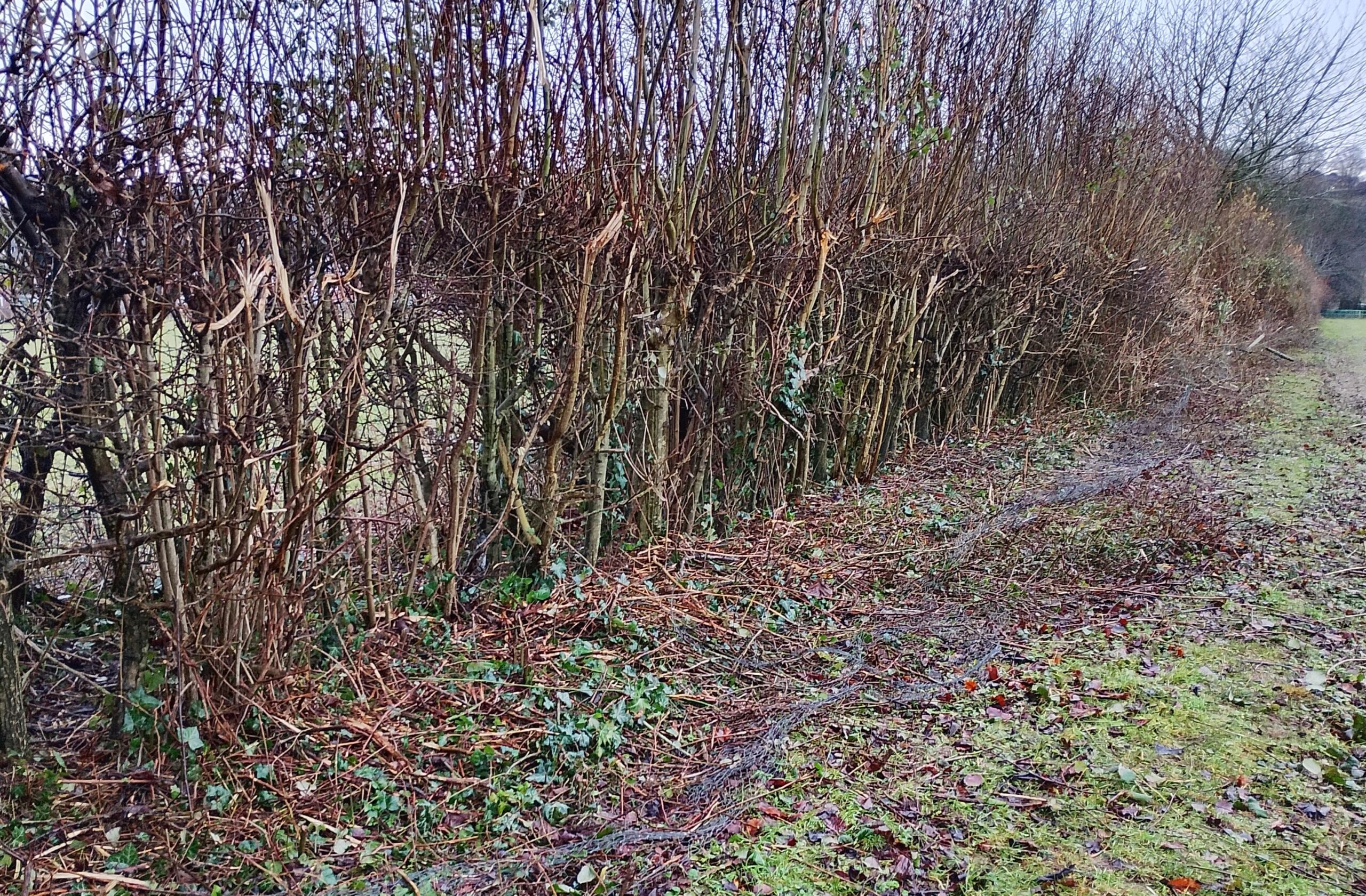 The barbed wire fence on this side will have been removed and most of the brash and brambles at ground level cleared away from this side of the hedge. Ellie will provide 60m (or more) of materials but other teams will work further on this hedge after us.