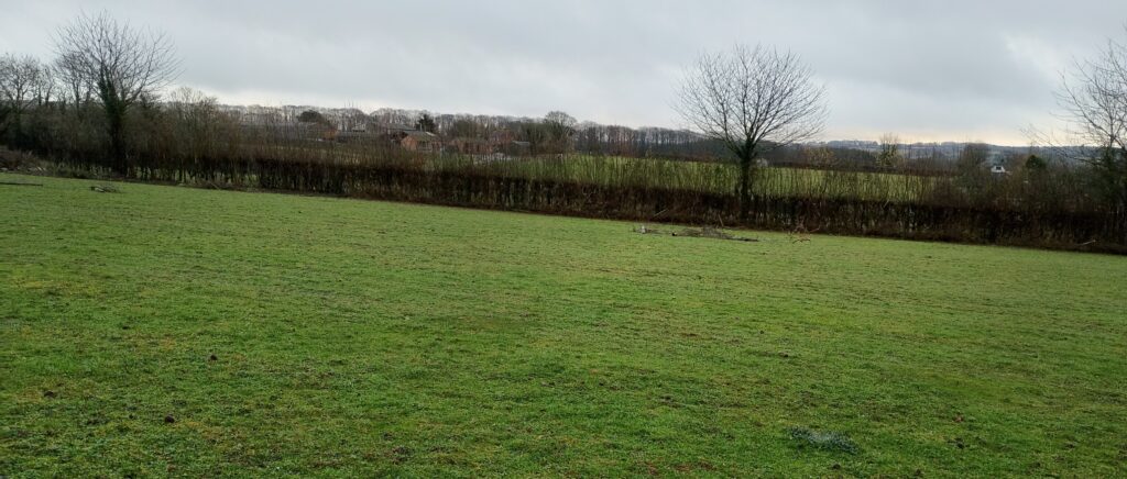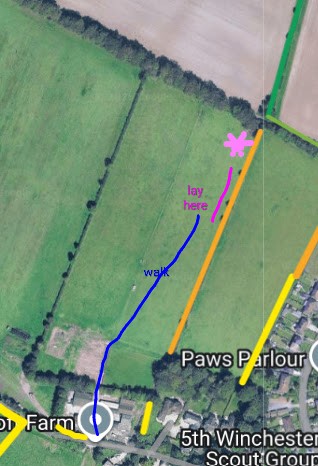 See the venue notes for getting there. From the farmyard collect all the tools you will need and head uphill into a field and over towards the top of the hedge on the right.